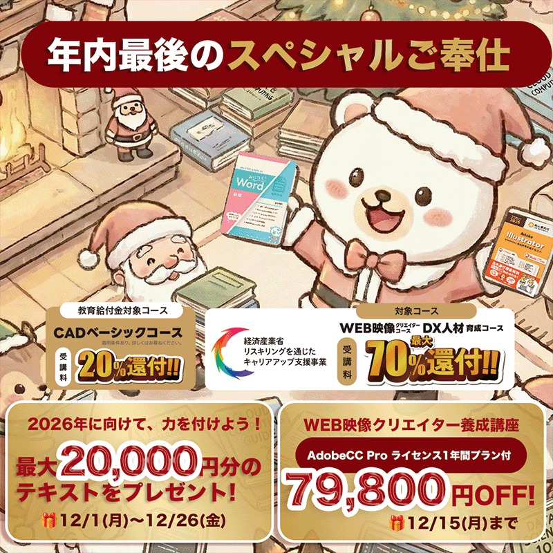Adobeのデザイン系ソフトを網羅し映像を含めたクリエイターを短期で養成します。SNSが全盛の時代、世界標準であるAdobeのソフトを使いこなせるクリエイターを目指します。映像業界やWEB業界への就転職を目指す方、在宅やフリーランスを目指す方に最適。(就職支援付き)